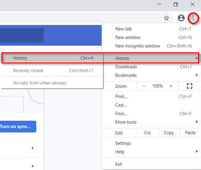 In Google Chrome, select the three dots in the top right and select History.