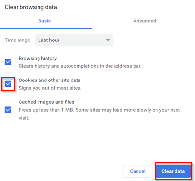 Select a time range and make sure Cookies and other site data is ticked. Select Clear data.