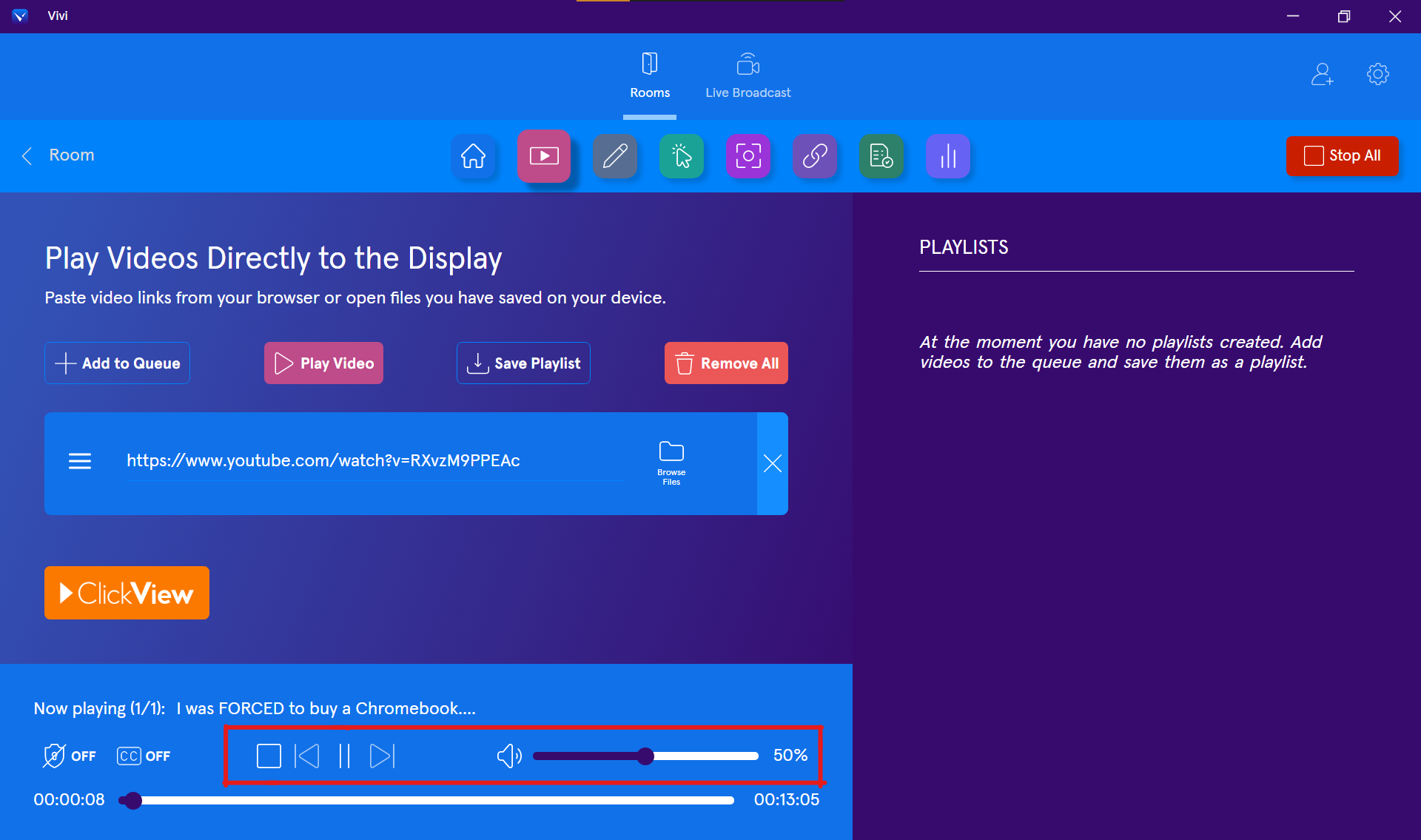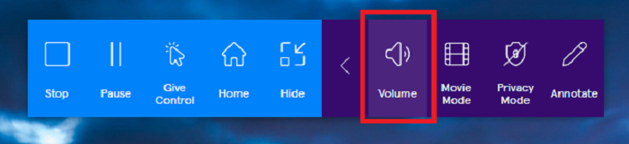 When sharing content to the Vivi you will have control options for playing, pausing, and adjusting volume. All TVs are physically set to 70 volume. Please use Vivi to adjust accordingly.