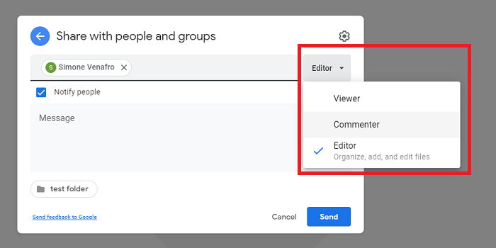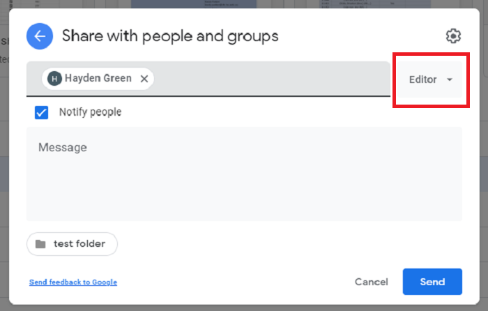 Once you have selected the person you are sharing to you can edit their permissions by clicking Editor.