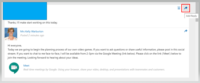 Students and teachers reply to messages by clicking on the 'add reply' arrow (right of the message). A trail of message will appear on your class page.