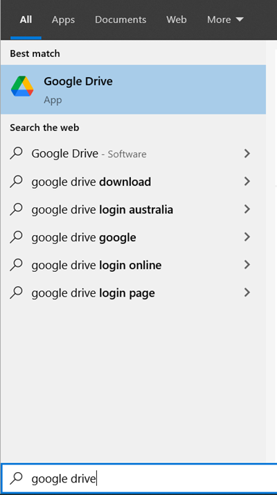 Press the β Windows key and start typing βGoogle Drive.β